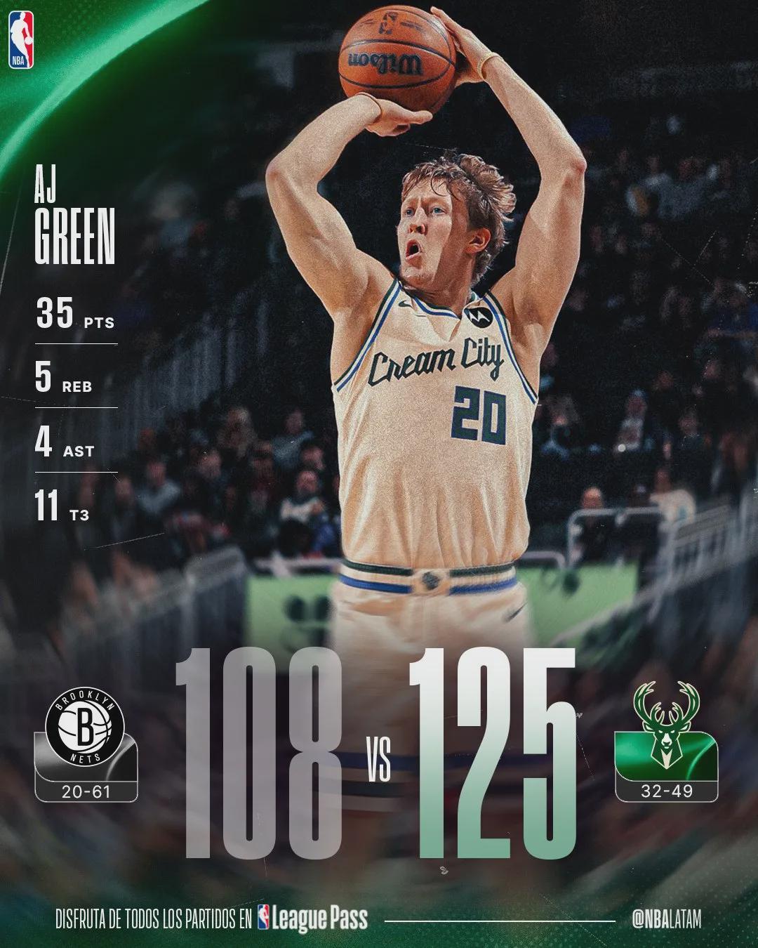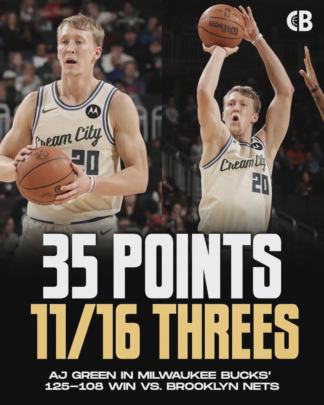 雄鹿125-108大勝籃網(wǎng),雄鹿射手AJ-格林開啟暴走模式,第四節(jié)連中5記三分,單節(jié)砍下17分。全場(chǎng)比賽,AJ-格林三分16中11,罰球2中2,狂轟35分5籃板4助攻2搶斷,正負(fù)值+29全場(chǎng)最高。單場(chǎng)35分生涯新高,此前只有27分。