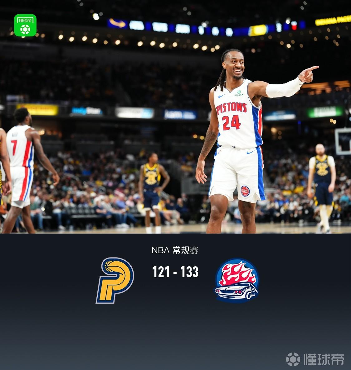 第四節(jié)步行者杰-赫夫拿下8分,活塞賈文特-格林拿下6分,最終步行者121-133不敵活塞