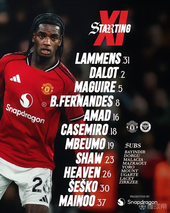 曼聯(lián)首發(fā):31-拉門斯、2-達洛特、5-馬奎爾、26-海文、23-盧克-肖、37-梅努、8-B費、16-阿馬德-迪亞洛、18-卡塞米羅、19-姆伯莫、30-謝什科
