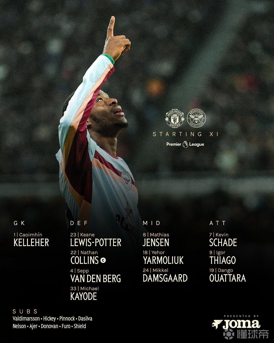 布倫特福德首發(fā):1-凱萊赫、33-卡約德、4-范登貝爾赫、22-內(nèi)森-科林斯、23-劉易斯-波特、18-亞爾莫柳克、8-延森、19-瓦塔拉、24-達姆斯高、7-沙德、9-伊戈爾-蒂亞戈